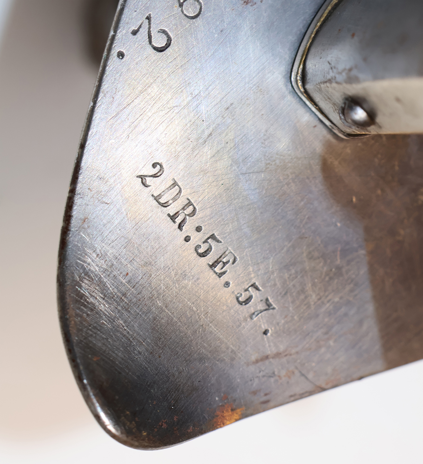 Ryttersabel M1843 med kanneleret rygstykke, endvidere stemplet 2DR:5E.57. Klingen mærket Frederiksværk … |