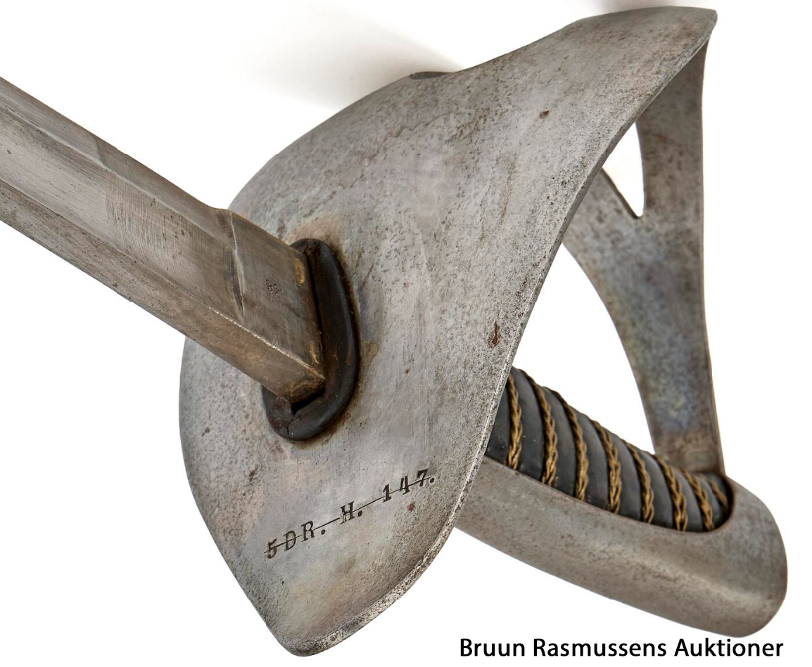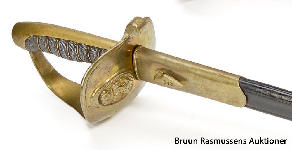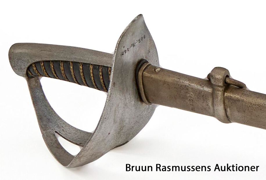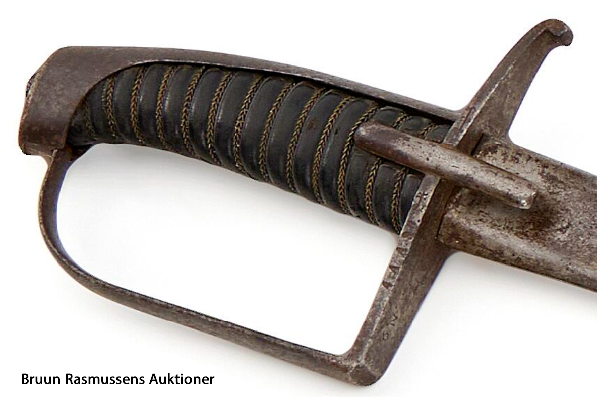 Ryttersabel M1843/99 med glat nakkestykke (overstreget), endvidere mærket med kronet 92. Klingen mærket … |