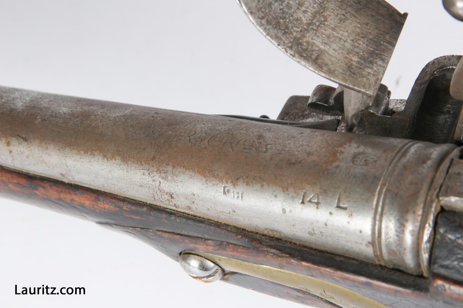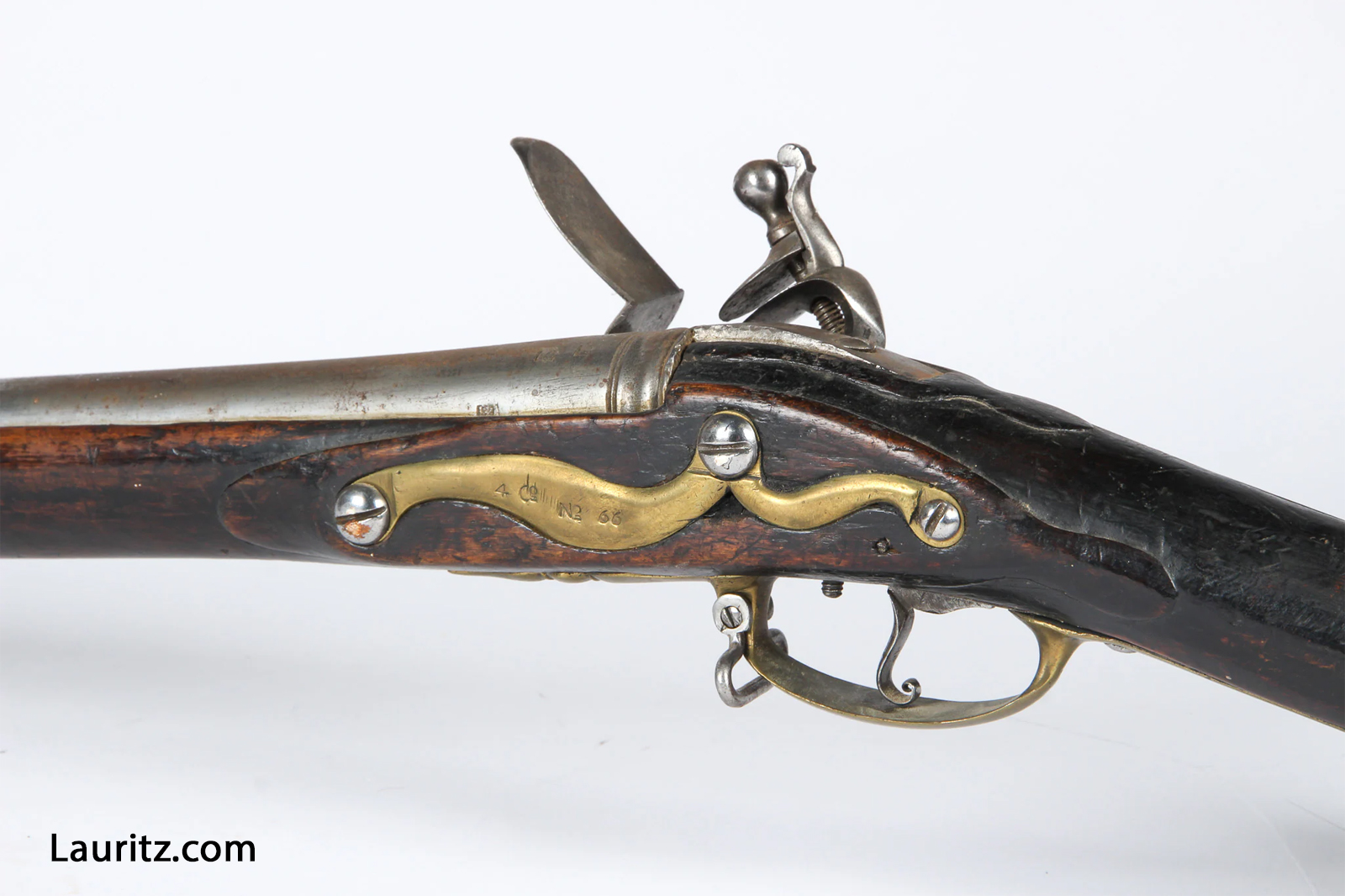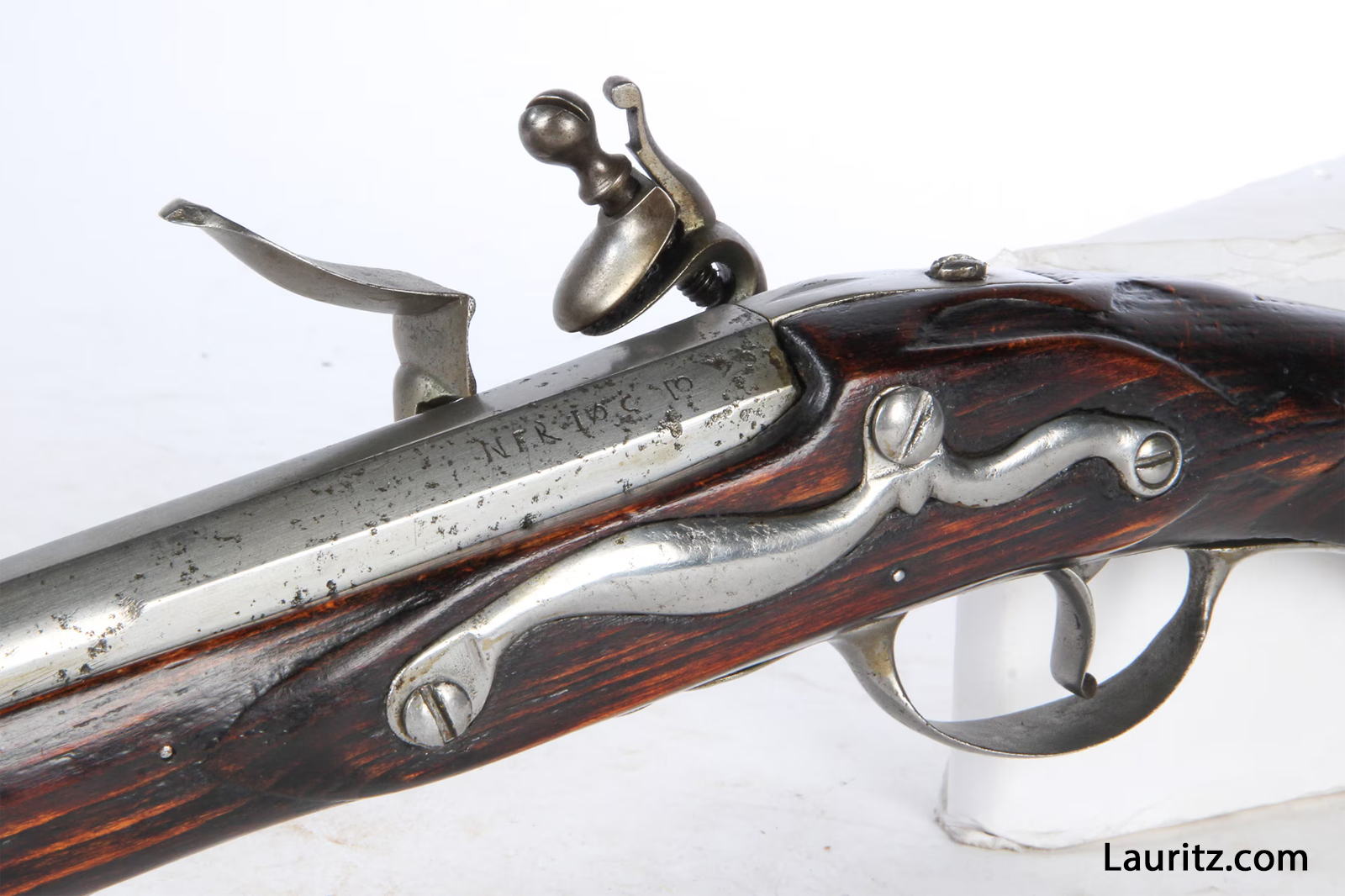 Sideblik på Flintelåsmusket M1748 afkortet til eksercitsbrug, endvidere stemplet RBC No. 25 på piben. … |
