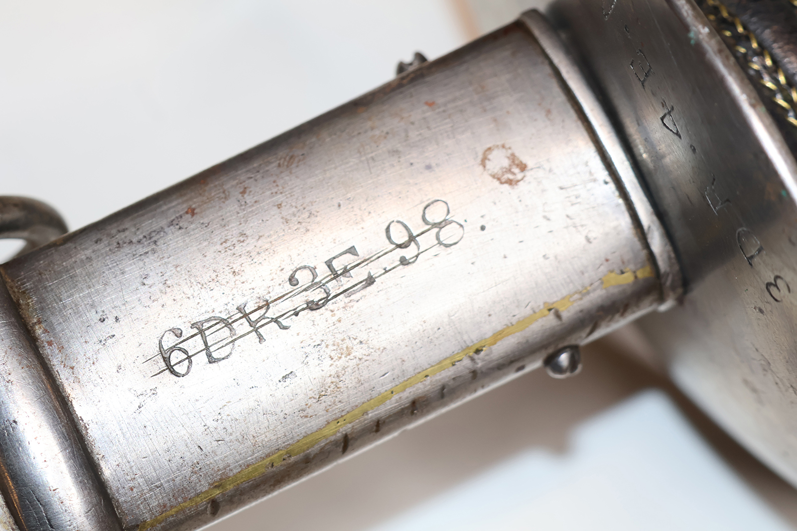 Skede for Ryttersabel M1843/99, endvidere stemplet 6DR.3E.98 (overstreget). |
