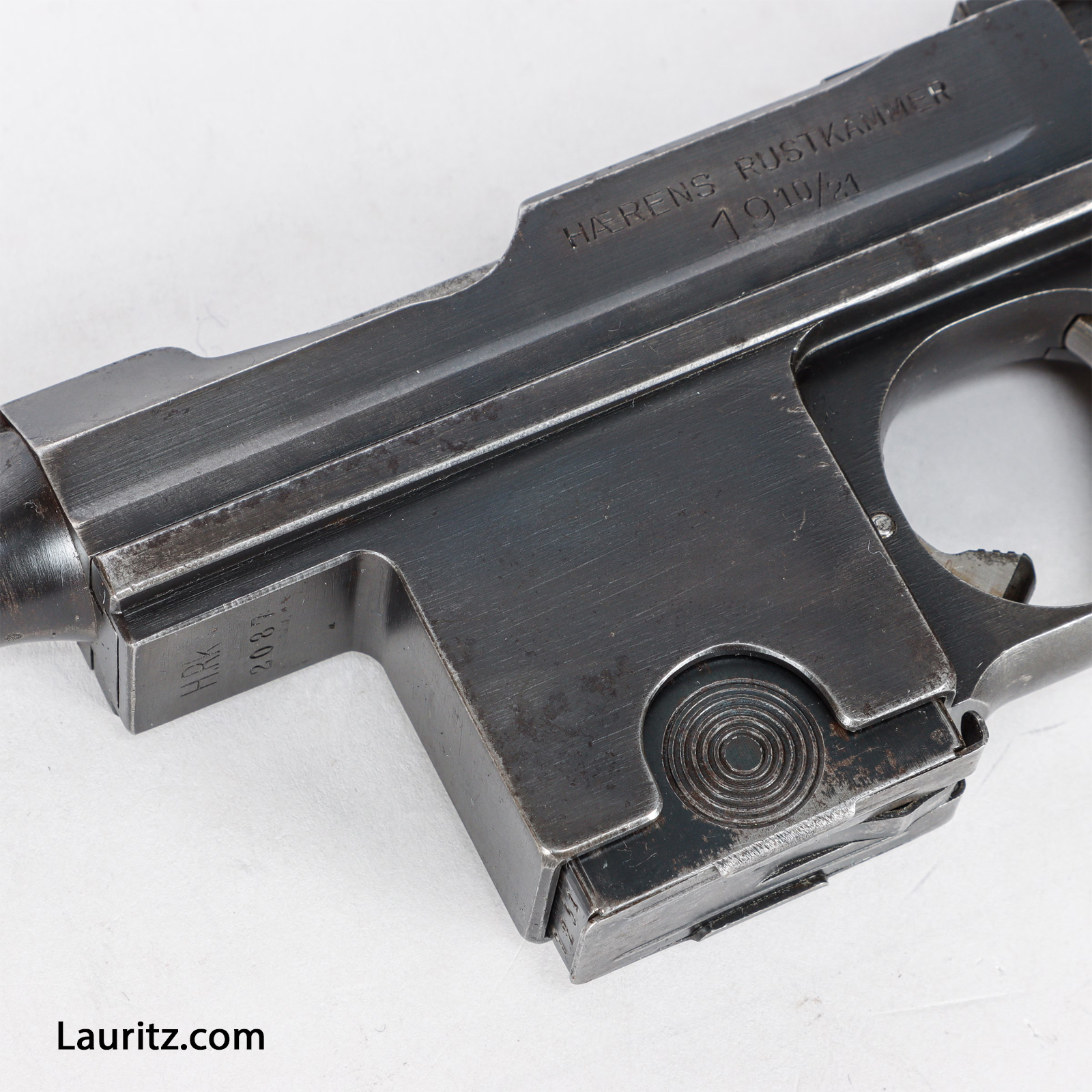 Pistol M1910/21 fra Hærens Rustkammer, endvidere mærket med inventarnummer 6929 på rammen. |