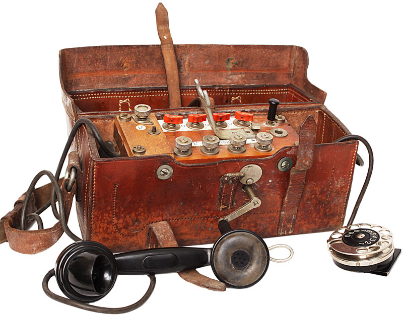 Felttelefon M. 1951 L. Denne felttelefon blev indført i 1951 som en universaltelefon der anvendtes ved regimenternes signalafdelinger og artilleriets signalformationer. Telefonen indgik i de faste vognpakninger og anvendtes som stationstelefon og prøvetelefon ved afprøvning af udlagte forbindelser. At telefonen er en universaltelefon betyder, at den kunne anvendes sammen med de midlertidig udlagte net, såvel som med fastnettet på både manuelle og automatiske centraler. Ved forbindelse til manuelle centraler anvendtes håndsvinget til at påkalde sig opmærksomhed og man bad derefter centraloperatøren om at oprette den ønskede forbindelse. I forbindelse med automatiske centraler fik man summetone, og drejeskiven anvendtes til at vælge ønsket nummer. Telefonen kan anvendes som centralbord for 4 linier. (Foto: Morten B. Jepsen)