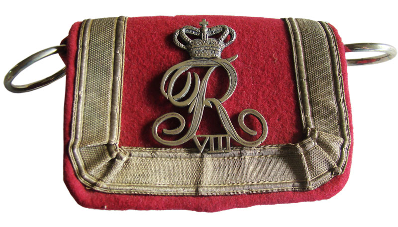 Patrontaske for officerer af Gardehusarregimentet af læder overtrukket med karmoisinrødt klæde med en bort af sølvfarvet guldtrækkerarbejde. På klappen ses Frederik 8.s kronede monogram i nysølv. Tasken er ikke anvendelig til det, den historisk var beregnet til, nemlig pistolammunition, men må siges at høre til det militære nips. Den blev båret til galauniform over venstre skulder i en bred sølvfarvet skrårem af guldtrækkerarbejde med karmoisinfarvet klædesunderlag, således at tasken sad ved lænden på højre side. Officerer ved dragonregimenterne og feltartilleriet bar tilsvarende tasker af sortlakeret læder med en sølvfarvet metalkant. Kong Frederik 8. (1843 – 1912) var 62 år gammel, da han d. 29.1 1906 overtog tronen, og han døde allerede 15. 5. 1912 i Hamborg på vej hjem fra et kurophold. (Foto: M. L. de Saint-Aubain).