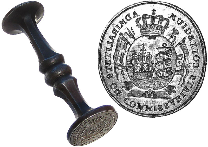 Admiralitets og Commisariats Collegiums signet. Admiralitets og Commissariats Collegiet blev oprettet i 1660. Det blev nedlagt i 1848 i forbindelse med afskaffelsen af enevælden. Det gamle kollegiesystem indenfor statsadministrationen blev med overgangen til folkestyre afløst af et ministeriesystem, som vi kender det idag, og Admiralitetskollegiets afløser blev Marineministeriet. Signeten er udført i stål og måler 35,8 mm x 33,4 mm, længde med håndtag 98 mm. (Foto: BBN)