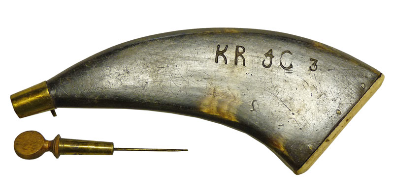 Krudthorn M1787 for jægere, fremstillet af kohorn som er presset fladt. Bunden er af ben. Ifølge “Den nye Th.Møller” blev krudthornet indført til brug sammen med jægerriffel M1785. Krudthornet er også anvendt sammen med senere rifler. Det indbrændte afdelingsstempel tolkes til: Kongens Regiment Jægerkompagniet nr. 3. Træproppen er forsynet med en rømmenål, der er et overordentlig praktisk værktøj til flintelåsvåben, hvor fænghullet let stoppede til. Proveniens: Tøjhusmuseet, København (Foto: Henry Chr. Christensen).