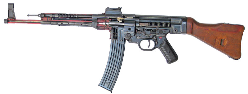 StG 44 (Sturmgevehr 1944) er et automatgevær konstrueret af Hugo Schmeisser hos C G Häenel for den tyske værnemagt i perioden 1942-44. Geværet anses for ar være det første moderne automatgevær og der blev fremstillet ca. 425.000 geværer før krigen sluttede. Geværet anvender en patron i kaliber 7,92x33 (7,92mm Kurtz) og kan anvendes til afgivelse af halvautomatisk og helautomatisk ild. Det her viste gevær er gennemskåret til undervisningsbrug. Dermed kan man studere geværets konstruktion og funktion. (Foto: BBN).
