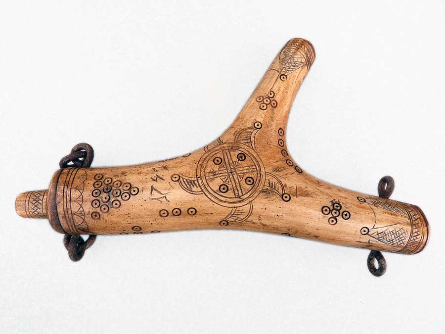 Krudthorn fra Ungarn lavet af hjortetak. Primitivt dekoreret samt mærket 1741. Største mål: 23 cm. (Foto: HCC).