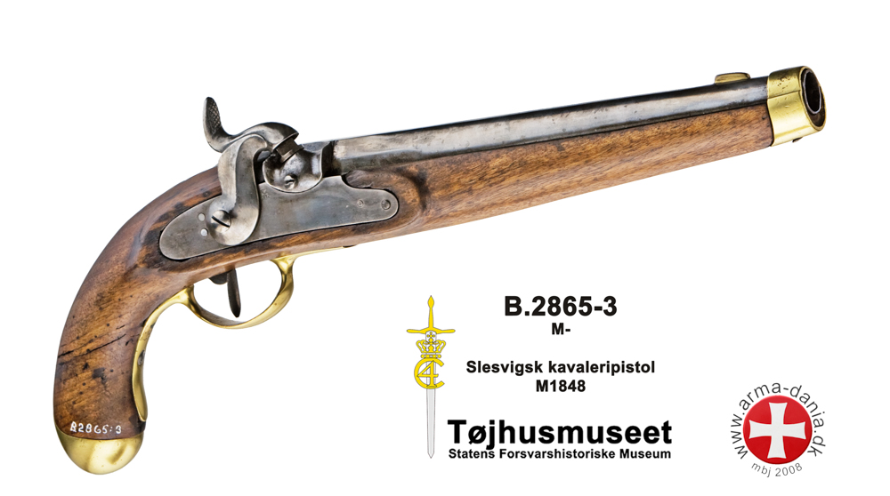 Slesvig-holstensk kavaleripistol M/1848 indkøbt af insurgenterne i Liege. Da Slesvig-holstenerne endelig blev afvæbnede i Rendsborg i 1850, fik vi store mængder våben fra tøjhuset der. Bl.a. var der et antal af disse kavaleripistoler som vel egentlig burde hedde M/1829/48. Disse blev ombyggede i København og blev til dansk SkibspistolM/1852. Og på denne måde kom denne altså med i det danske arsenal (Tøjhusmuseet Mus.Nr. B2865:3, Foto: Morten B. Jepsen).